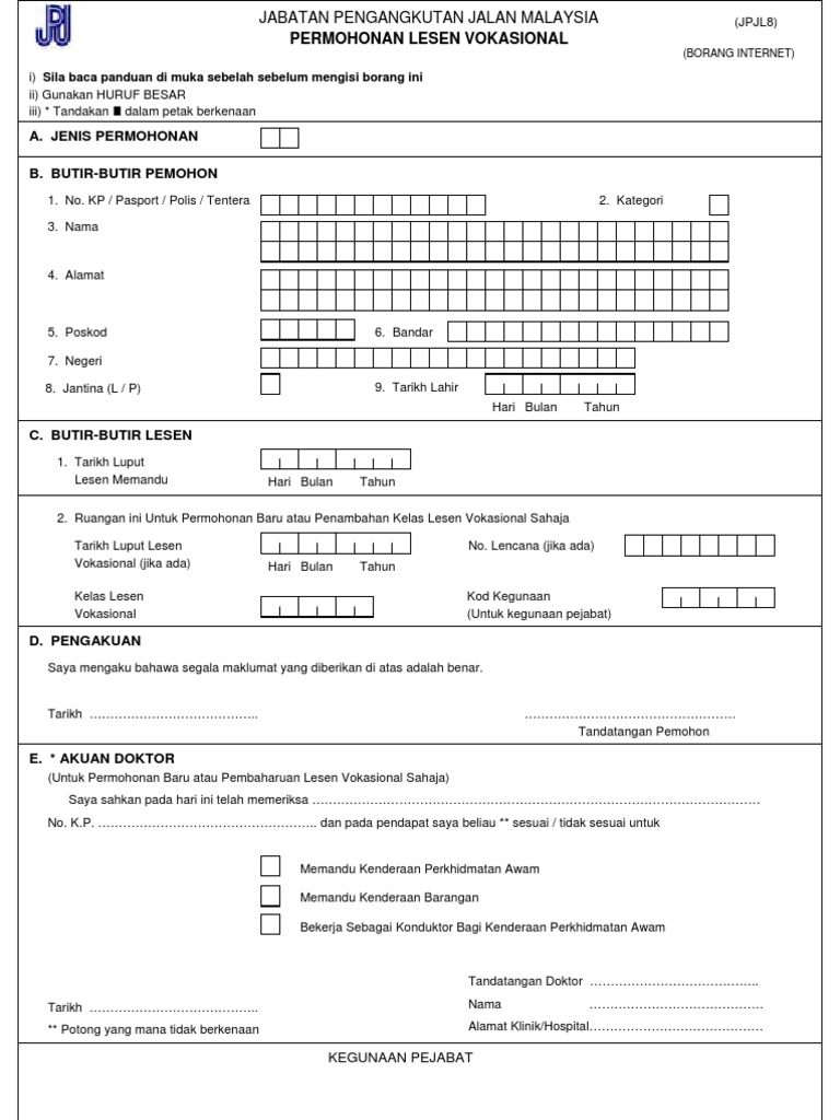Pembaharuan lesen memandu vokasional boleh dilakukan di jpj negeri/cawangan, utc dan kaunter 1jpj. The copyright of the image is owned by the owner, this website only displays a few snippets of several keywords that are put together in a post summary. Pembaharuan lesen memandu vokasionalboleh dilakukan di jpj negeri/ cawangan, utc dan kaunter 1jpj. Borang 'jpj l8' yang telah diisi resit bayaran pemeriksaan doktor sekeping gambar berukuran lesen (latar belakang putih) related documents jpjl8 borang permohonan pembaharuan lesen gdl Mengemukakan laporan perubatan dan tempoh sah laku laporan perubatan (borang jpj l8) tidak melebihi satu (1) tahun;